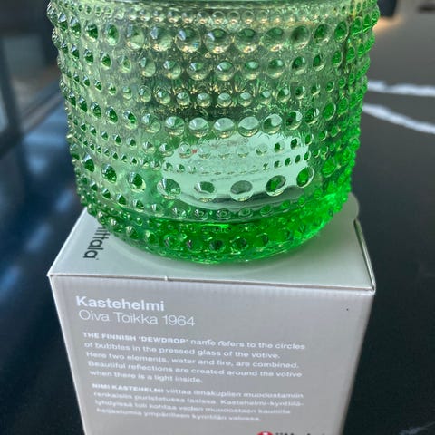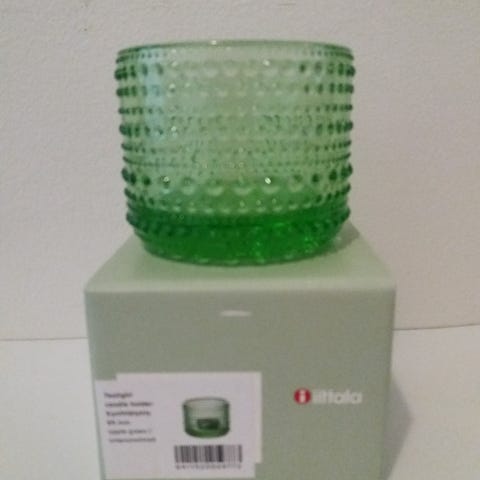 Iittala Kastehelmi kynttilälyhty omenan vihreä, vihreää lasia. Käyttämätön. hinta on yhdelle ja myynnissä kaksi kappaletta. Samaa sävyä löytyy myös mariskooli ja laseja.