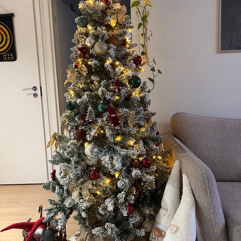 180cm kuusi led-valoilla. Laatikko löytyy mutta ei ehjänä, joutuu teippaamaan kun laittaa kuusen pois esiltä. :)