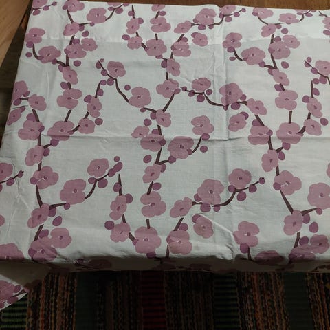 Ihana, läpikuultava kappaverho missä keijun ja kukan kuvia.