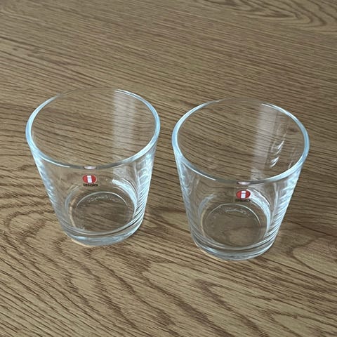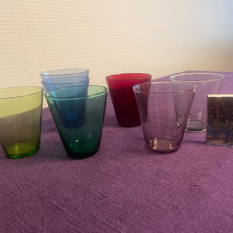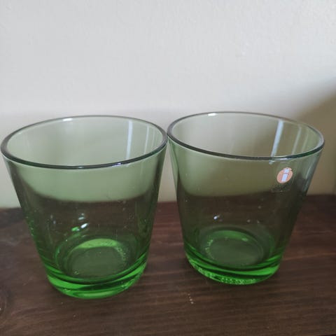 Kaksi kappaletta Iittala kartiolasi omenan vihreä. käyttämättömät. Kaksi lasia maksaa 12 €. Myynnissä kolme settiä. Samaa sävyä löytyy myös mariskooli ja tuikkuja.