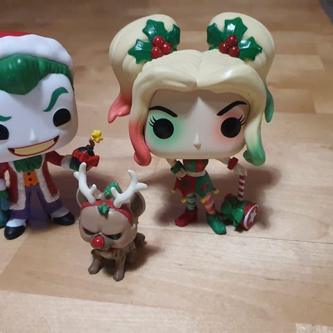 Funko Pop Harley Quinn figuuri, väriltään punainen, sininen ja valkoinen. Materiaali muovi. Pientä kulumaa leuassa (kuva).