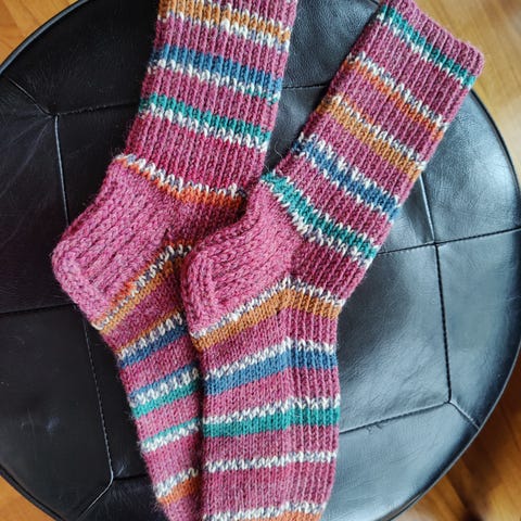 Käsin kudotut villasukat 7 veljestä langasta. Koko 41 (26 cm) ja väri tummanharmaa & liila. Kissatalous 🐈