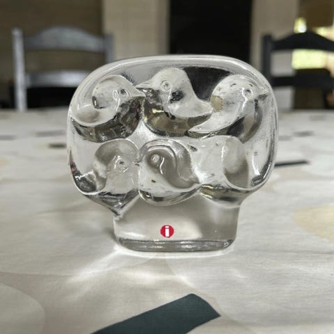 Lasipaino Lintupuu, jossa Iittalan tarra paikoillaan. Särötön, kolhuton ehjä. Design Jorma Vennola. Maksu käteisellä tai Mobilepaylla.