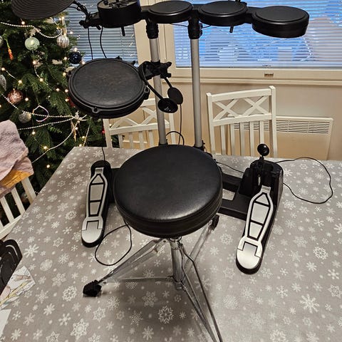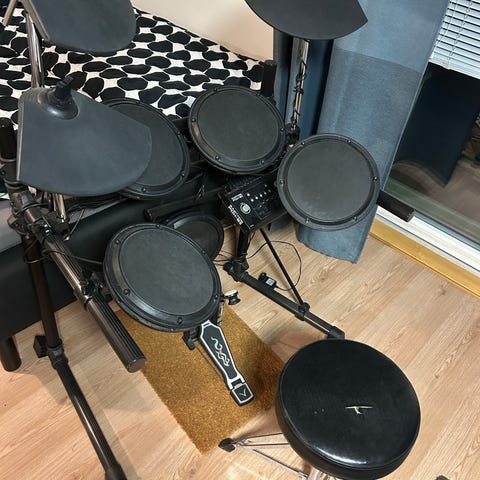 Rolandin vikaiset sähkörummut tuplapedaalilla. Osa osista toimii, osa ei. Ei olla koitettu katsoa, missä vika.