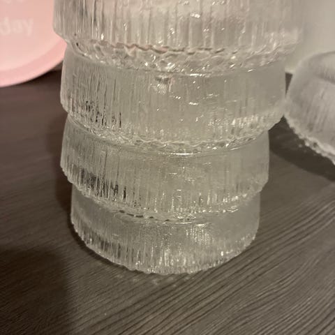 Iittala Ultima Thule lasiastia, halkaisija 8 cm, kirkas väri. Astia on valmistettu lasista ja siinä on teksturoitu pinta, joka muistuttaa sulanutta jäätä. Soveltuu käyttöön keittiössä ja pöytäkoristeeksi.