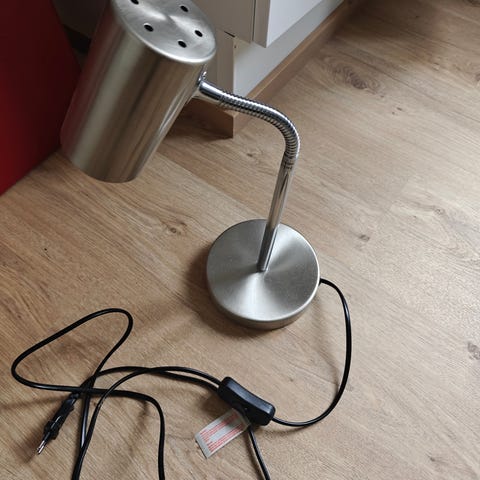 Musta pöytävalaisin, jossa on lankamainen varjostin. Valaisimessa on virtajohto ja kytkin. Sopii sisäkäyttöön pöytävalaisimeksi.