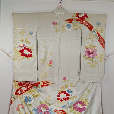 Tämä on vintage-tyylinen vaaleanvihreä silkkinen Furisode-kimono, jota koristaa kaunis feeniksi- ja kukkakuvio.