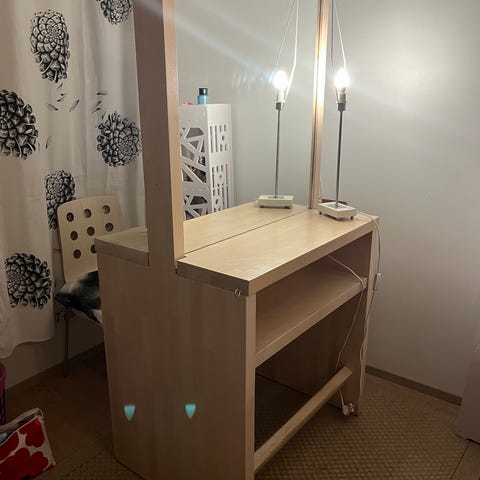 Kampauspöytä, pinta kulunut, mutta peili hyvä kuntoinen. Olen kiinnittänyt peilien seinään tarralapulla.
