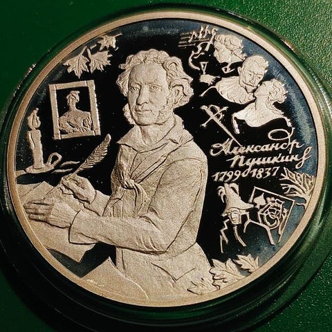 3 ruplan kolikko (Puškin )seisoo). Sarja: Pushkinin syntymän 200. vuosipäivä, 1999, Moskovan rahapaja. Laatu: Proof.