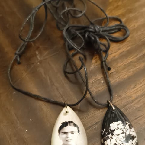 Korusetti sisältää kaksi Frida Kahlo -aiheista kaulakorua ja kaksi erilaista paria korvakoruja. Korut yhteensä 20 €. Nouto tai postitus. Postittaessa postimaksu 4 €.