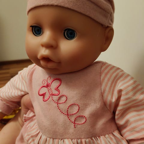 Puhuva Amanda nukke ja siihen kuuluvat tarvikkeet. Nukella on vaaleat hiukset ja se on pukeutunut vaaleanpunaiseen ja siniseen asuun. Mukana erilaisia leikkiruokia ja harja.