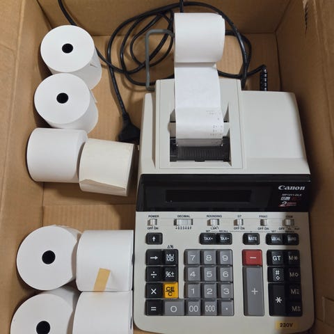 Toimiva ja vähän käytetty canonin tulostava laskin. Täysi paperirulla mukaan. Sopii esimerkiksi kirjanpitoon tai taloushallintoon.