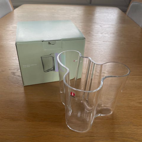 Uutta vastaavassa kunnossa oleva Alvar Aalto -kokoelman 9,5 cm kirkas maljakko. Ehjä, siisti I-tarra. Pohjassa hiukan poistetusta tarrasta jääneitä liimajäämiä, puhdistan pois ennen myyntiä. Ei alkuperäispakkausta. Valmistettu Iittalan lasitehtaalla Suomessa.
