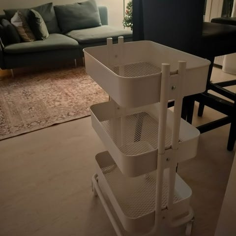 Ikean tarjoiluvaunu. Tuotteen linkki: https://www.ikea.com/fi/fi/p/nissafors-tarjoiluvaunu-valkoinen-40465733/#content
