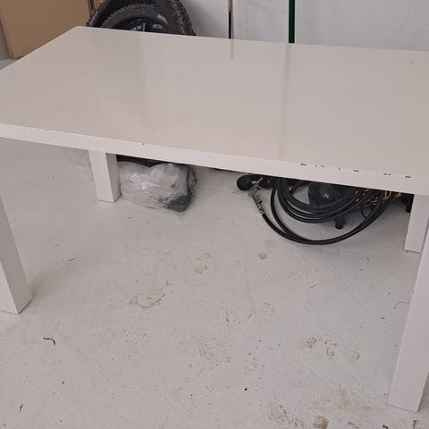 Annetaan ruokapöytä, kärsi hieman muutossa kosteudesta, jonka vuoksi kuprua pöytälevyn sivulla (katso kuvat). Jalan saa erilleen pöytälevystä.