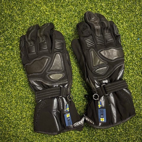 Nahkaiset moottoripyöräilyyn sopivat hanskat.