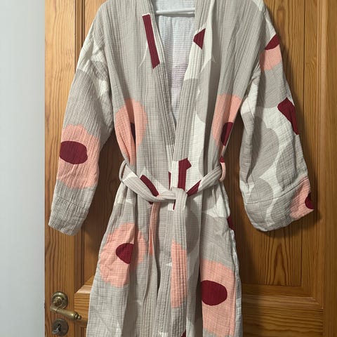 Myydään Marimekko Unikko kylpytakki, valmistettu puuvillasta. Väri valkoinen, koko M-L. Kylpytakissa on vyö ja huppu.