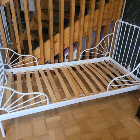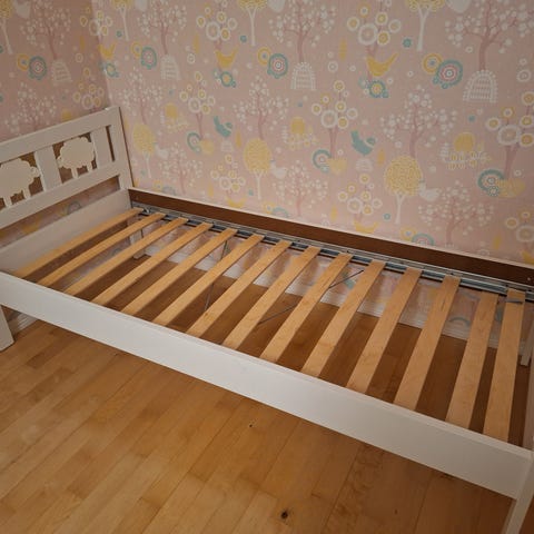 Sänky tällä hetkellä neljässä osassa. Mukaan saa halutessaan patjan, jossa myös jatkopalat ja petarin. :)