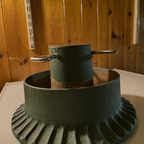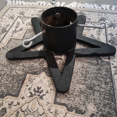 Tukeva ja painava valurautainen joulukuusenjalka. Kuusenjalassa on reilu vesitila ja kolme kiristysruuvia.