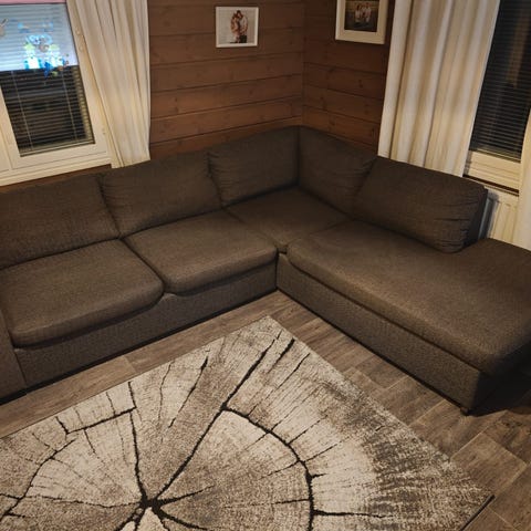 Tummanharmaa kohtalaisessa kunnossa oleva divaani/kulmasohva. Koiratalous. Pesu jää ostajalle, tyynyissä irrotettavat päälliset joissa hieman kulumaa takapuolella. Sohvassa pieni reikä, jota ei huomaa käytössä, siitä kuva. Voidaan kuljettaa pienellä lisämaksulla.