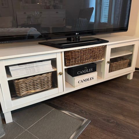Tv-taso, valkoinen, mänty, puukansi ja -hyllyt, lasiovet
