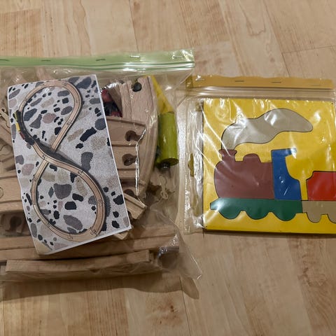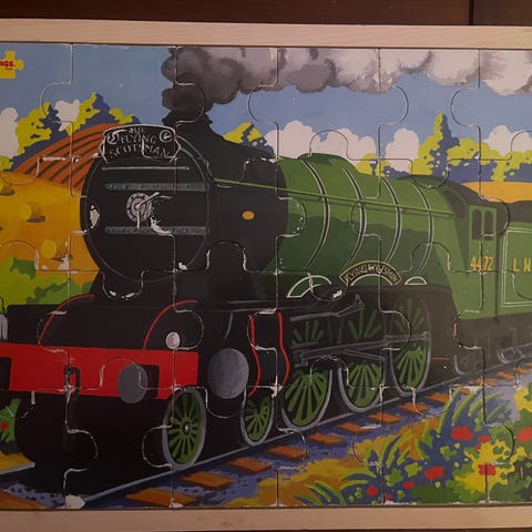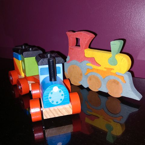Pitkä junapalapeli. Saa yhdeksi pitkäksi junaksi mutta ei mahtunut kuvaan niin. Ei laatikkoa. Molemmilla puolilla kuvat.