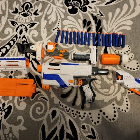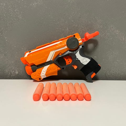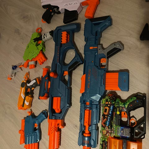 Nerf Elite lasten leluase, varustettu sinisellä ja oranssilla väriyhdistelmällä.