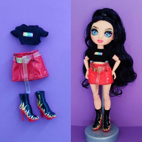 Myydään kuvanmukainen vaatesetti ja viisi kenkäparia Rainbow High nukeille.