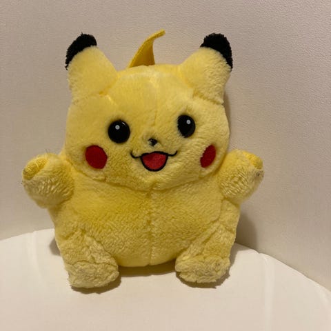 Pokémon Pehmolelu Pikachu. Keltainen pehmolelu, jossa on merkintä Pokémon. Pehmolelu on pehmeä materiaali ja sopii lasten leikkeihin. Sisällä patterikotelo, jonne patterit vaihtamalla saa lelusta kuulumaan ääniä.