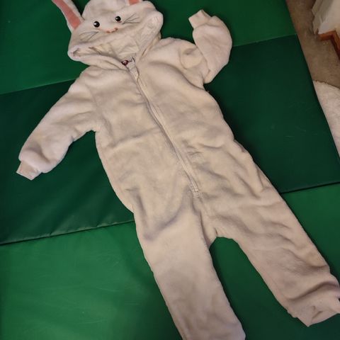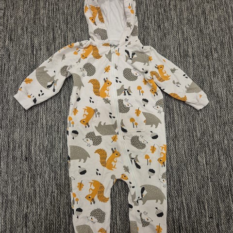 Käyttämättä jäänyt (oli sopiva kesällä kun ei ollut tarvetta) pehmoinen mutta ei paksu velourpintainen karhunpentujumppis/haalari koossa 80cm. Hieman reilu eli menee myös 86 siirtymässä.