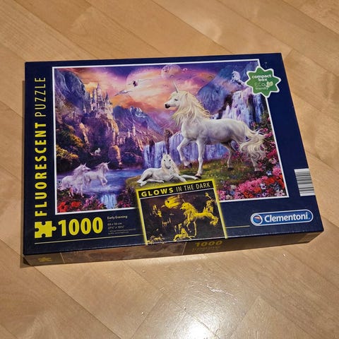 Clementoni Fluorescent Puzzle 1000 palaa. Palapelin koko on 1000 palaa, ja se sisältää fluoresoivia elementtejä, jotka hehkuvat pimeässä. Sopii aikuisten ja nuorten käyttöön. Materiaali on standardi palapelipahvi.