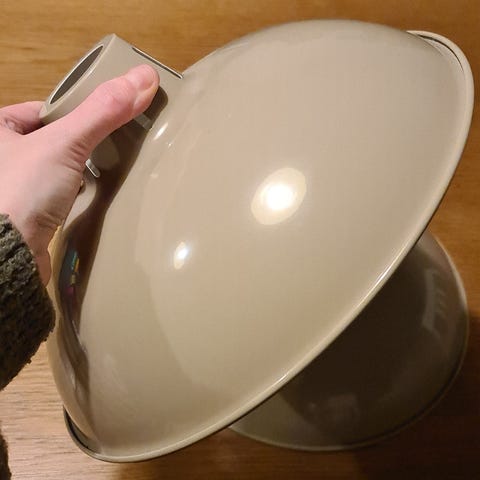 Myynnissä metallinen kattovalaisimen varjostin. Ulkopuoli on vaalea beigen värinen ja sisäpuoli valkoinen. Jäänyt kokonaan käyttämättä. Mukaan ei tule lampunkantaa eikä valonlähdettä, vain varjostin. Halkaisija 31 cm ja korkeus 12 cm.