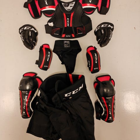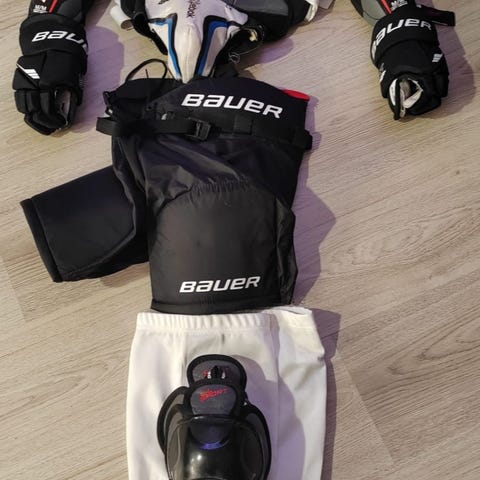Bauer Lil Sport jääkiekko varustesetti, joka sisältää hartiasuojat, kyynärsuojat, hanskat, housut, säärisuojat. Lisäksi alasuoja, kaulasuoja, paita ja sukat. Polvisuojissa ja sukissa käytön jälkiä, muuten kunto erinomainen. Soveltuu n. 7-9 vuotiaille.