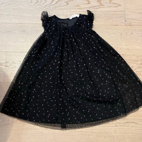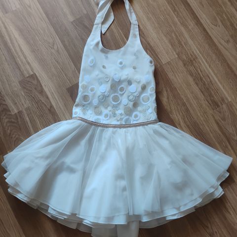 Punainen juhlamekko koossa 128 cm. Valoitus tekee reunoihin tummemmat sävyt mutta todellisuudessa näin ei ole.