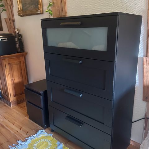 Muuten loistokunnossa oleva lipasto vetolaatikoilla, pöytäpinnassa kaksi pikku painaumaa ja satunnaisia pikkuviiruja.