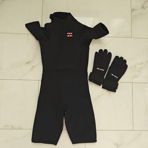 4-5mm, Billabong kokopitkä märkäpuku, vesiurheiluun. Polviin pientä paikkausta neopreeniliimalla.