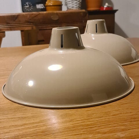Myynnissä metallinen kattovalaisimen varjostin. Ulkopuoli on vaalea beigen värinen ja sisäpuoli valkoinen. Jäänyt kokonaan käyttämättä. Mukaan ei tule lampunkantaa eikä valonlähdettä, vain varjostin. Halkaisija 31 cm ja korkeus 12 cm.