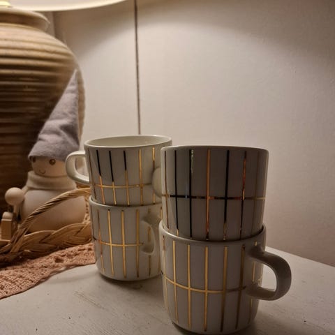 Marimekko Tiiliskivi muki 4 dl keltainen. Myynnissä 2 kpl uudenveroista mukia. Molemmat ovat yhtä hyvässä kunnossa, kuin ostovaiheessa, vain tarrat irroitettu. Tarkin silmä voi löytää toisen mukin kahvasta pienenpienen pisteen, joka tullut tekovaiheessa, kuitenkin ykköslaadun muki.
