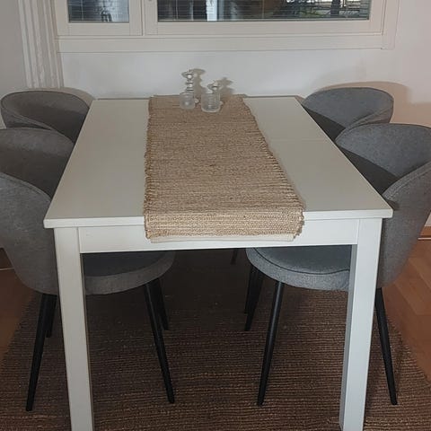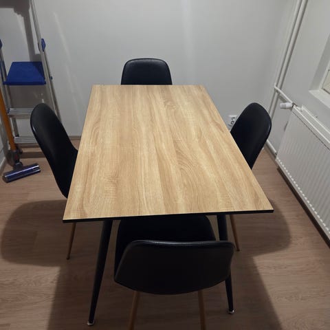 Vekeltä muutama vuosi sitten ostettu ruokapöytä. Ei naarmuja eikä kolhuja, ainoa virhe pieni liuottimesta jäänyt ns. öljyläikän näköinen laikku (n.2-3cm) kannessa, väri ei ole lähtenyt.