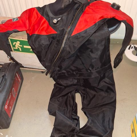 Kuivapuku, kiinteillä hanskoilla. Vaatii kaulamansetin huoltoa