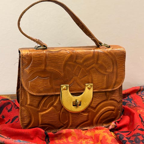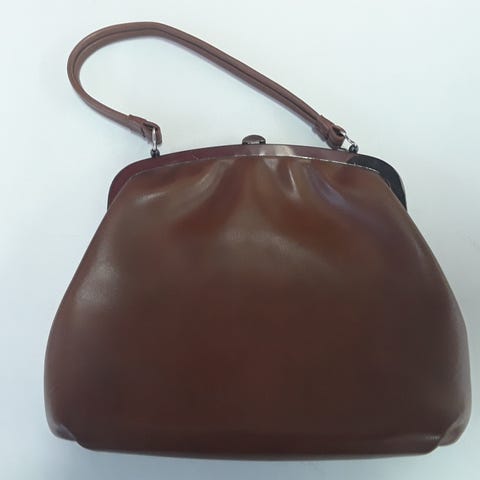 Ehjä ja ikäisekseen hyväkuntoinen käsilaukku, ruskeaa nahkaa. Joitakin läikkiä sisäkankaassa. Kaksi sisötaskua, toinen vetoketjulla, toimii. Laukun lukkomekanismi toimii.