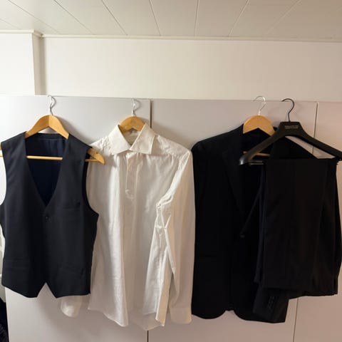 Takki 50 ja housut 48. Villasekoite.