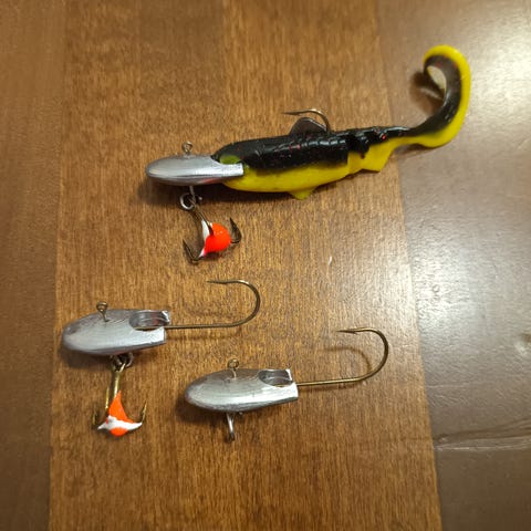 Myydään oma valmisteiden jigipäät 3kpl painoa 9g. 2 värikoukut.
