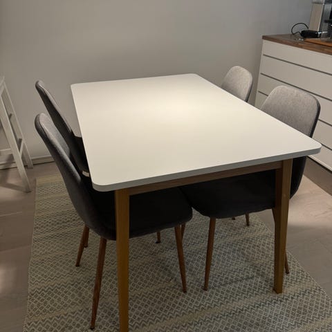 Ruokailuryhmä ostettu puolivuotta sitten Jyskistä. Uudenveroisessa kunnossa. Ei eläintaloutta tai tupakointia. Pöydän päällä olevat tuotteet eivät kuulu hintaan/ei ole myynnissä. Vain nouto ja maksutapana käy mobilepay tai käteinen. Ovh 325€ HUOM. Myynnissä muuallakin