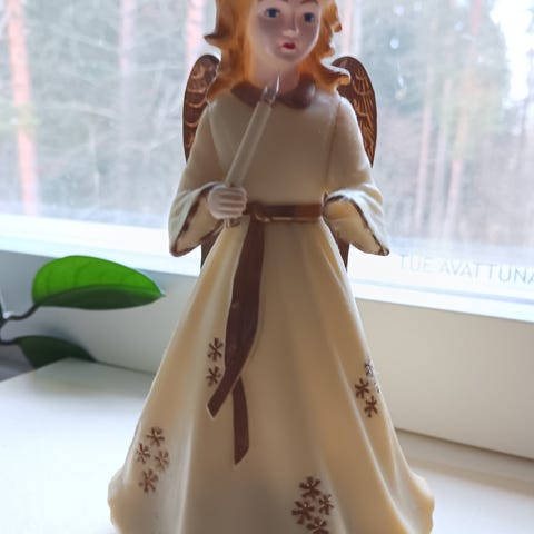 Suloinen vintage enkelihahmo, jossa enkeli istuu pilven päällä ja ympärillä on kultaisia tähtiä. Hahmolla on vaaleanpunainen mekko vaaleansinisellä helmalla ja käsissään se pitelee hymyilevää tähteä. Lempeä ilme ja nostalginen kitsch-henkinen muotoilu tekevät tästä ihanan koriste-esineen keräilijälle tai tunnelmalliseen sisustukseen.