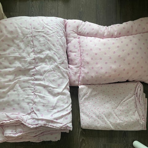 Disneyn makuupussukka ja peitto. Vetoketju toimii. Muutama tahra jota itse en saanut pestyä pois.