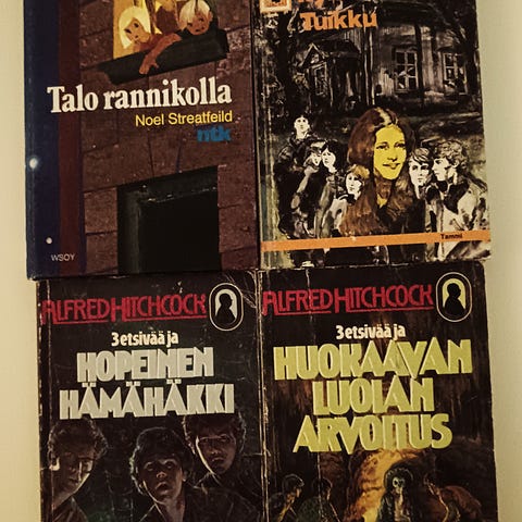 Hyväkuntoisia nuorten kirjoja: Enid Blyton kirjoja, Jo Nesbon Tohtori Proktorin aika-amme, Ella ja yön ritarit, Maukka ja Väykkä, Kapteeni kalsari seikkailee, Valopäiden veljeskunta, Kauhukartano kirjoja. Kaikki ehjiä ja siistejä, osassa omistajan nimi mutta ei muita merkintöjä eikä suttuja. Voit ostaa kaikki kerralla tai vain osan. Kaikki yhteensä 20 €, erikseen 1-5 €/kpl.