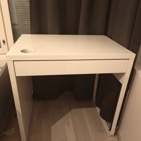 Kannessa muutama huomaamaton jälki ja sivuun lisätty koukku repulle. Tilava laatikko. Ollut teinin koulupöytänä.