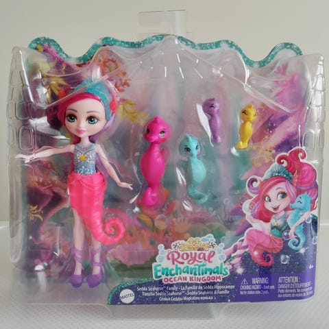 Leikkisetti sisältää vaaleanpunaisen merihevosen, pienemmän merihevosen ja meritähtihahmon.