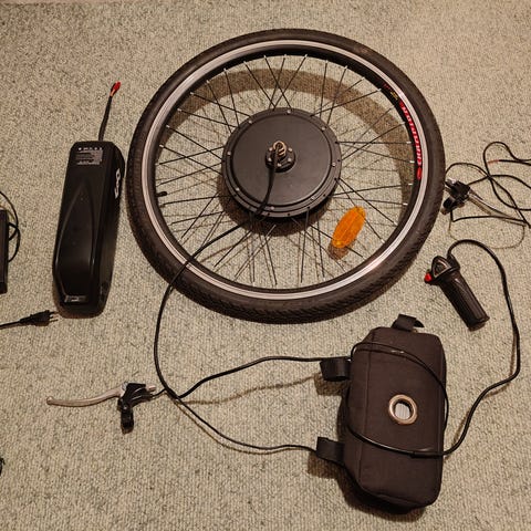 Eteen toinen kiekko 200w sille ohjainpiiri ja oleelliset piuhat, magneetti, jarrun tehostin ja näyttö. Tämä setti on enempi ajettu -1000km+ Toimii kyllä ilman ongelmaa. Ostettu tälläisenään projekti jäi uuden tullessa.